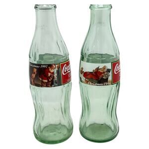 Pair of collectible Coca-Cola Classic 8 oz glass bottles featuring Santa Claus holiday artwork from 1996 and 1997. One bottle includes the original red cap. These limited edition bottles were part of seasonal promotions and are perfect for collectors of Coke memorabilia or vintage advertising.