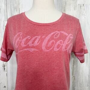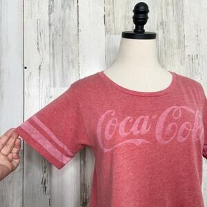 Coca Cola red heathered knit spell out football graphic t-shirt.