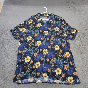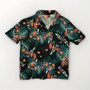 Men's Coca Cola Hawaiian shirt in size XXL featuring a vibrant black tropical floral print with classic Coca Cola bottles. This short-sleeve aloha shirt has a button-front closure and a chest pocket for added functionality.