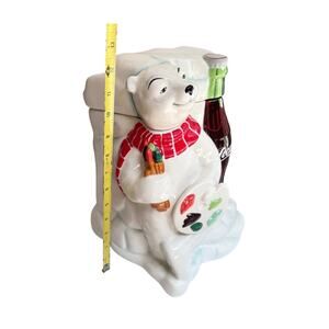 • Whimsical ceramic cookie jar of a polar bear painting beside a classic glass Coca-Cola bottle. Hand-painted details and a glossy finish. Made by Gibson and officially licensed by Coca-Cola.