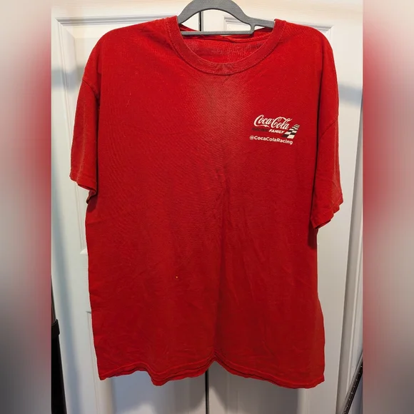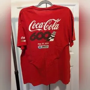 Bold red tee with Coca Cola & NASCAR Racing logo. 2014. Short sleeves for casual wear. missing tag but likely xl. some imperfections / stains.