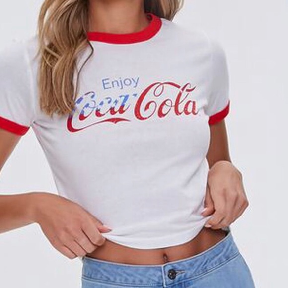 A knit ringer tee featuring "Enjoy Coca-Cola" Americana text graphic, crew neck, short sleeve, form-fitting, and contrast trim. Official licensed product. 100% cotton