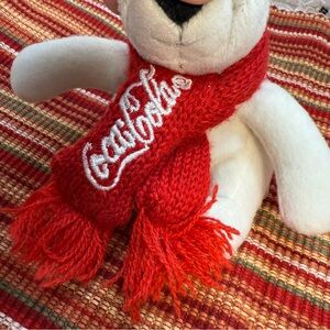 Charming Coca-Cola bear. Wears a bright red scarf with logo.