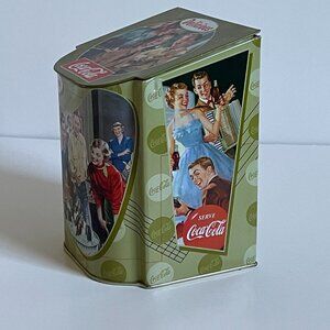 Very cool Coca Cola tin container with a hinged lid. Great for storage.