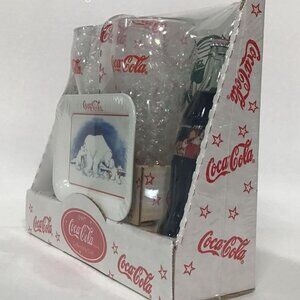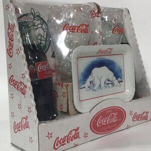 This 1997 Coca-Cola Collectible Gift Set contains two glasses, two 8oz. bottles & a Coca-Cola Bear Tray. All brand new. The original plastic is with this set, some of the plastic came away from the set, so, all of the plastic will be shipped to you anyway but will include "shrink wrap" that still holds the entire set in the original box.