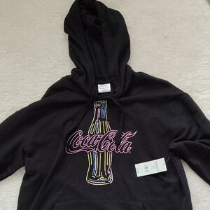 -Stylish black hoodie with a vibrant neon Coca-Cola bottle design. Size XL (15-17)