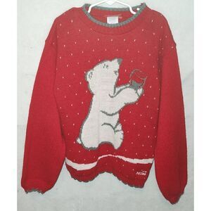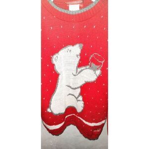 Coca-Cola Child's Red Polar Bear Coke Holiday Christmas Sweater Small 6/6x. Small snag on back. See images. Measurements shoulder to hem 18". Armpit to armpit 15.5". Armpit to end of sleeve 15".