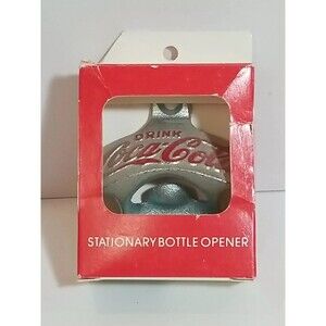 This is a Coca-Cola wall mount bottle opener that was created in 1991. It is a silver color and comes with the original box and screws. The opener is brand new and has never been used. It features the iconic Coca-Cola logo and is a great addition to any soda-themed collection. This item is an original and was made in the United States.