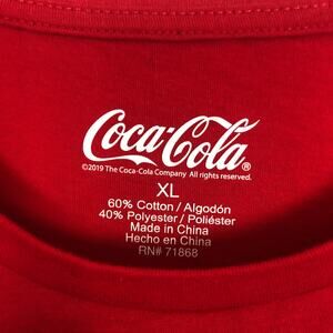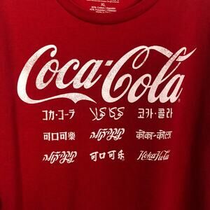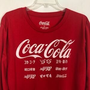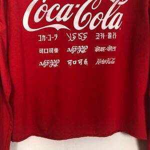 Coca-Cola in various languages crop red top. Long sleeves. Ribbed neck and cuffs. Raw hem. Cotton polyester blend. The white letters have some discoloration and has minor pilling. In good used condition. No stains, tears or holes.