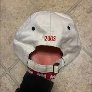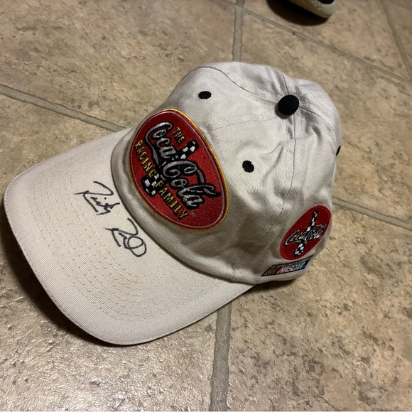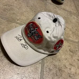 White cap featuring Coca-Cola Racing Family red logo patches. Includes signature on the brim.