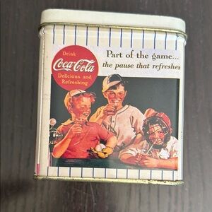Vintage 1992 Coca-Cola tin with red and white stripes. Features classic illustration of children enjoying drinks. Iconic branding with nostalgic appeal.