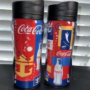 This set of travel mugs features vibrant Coca-Cola and Royal Caribbean graphics, making it a unique collectible for beverage enthusiasts and cruise lovers.