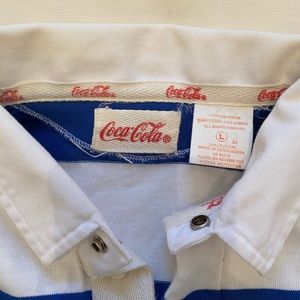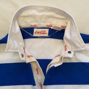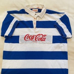 Vintage kids Coca-Cola Rugby Shirt. Short Sleeves. Vintage kids size large. Some discoloration on collar. Paint chipped on snap button. See photos. Approximate measurements: length 25 inches / width 20 inches