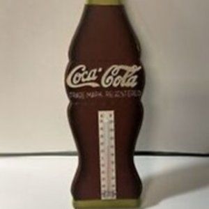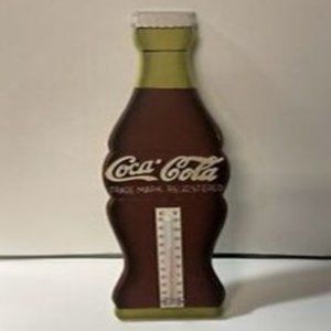 Coca-Cola Contour bottle thermometer made of wood. It displays temperature in Fahrenheit & Celsius. New without tags condition. Height: 17 ¼” & Width: 5”