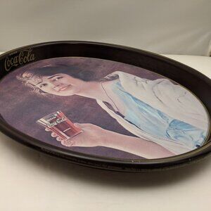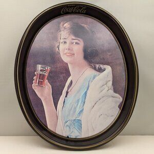 Vintage Coca-Cola oval tin sign featuring a woman holding a Coca-Cola glass. Classic design with a black frame.