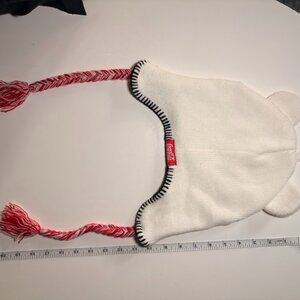 Adorable, warm and cozy beanie hat from Coca-Cola in the shape of a polar bear with red tassels like pig tails.