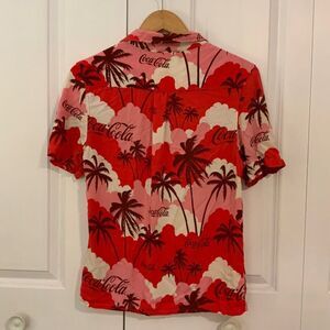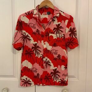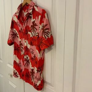 Coca-Cola Women’s Hawaiian Red Pink Button-Up Collared Short Sleeve Rayon Shirt