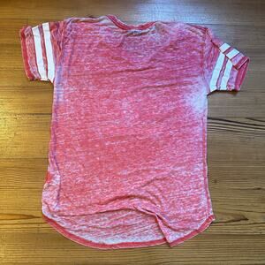 red with white graphic, short sleeve, cotton poly blend, almost sheer