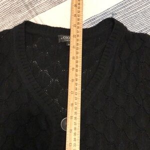 This is a Coccole short sleeve cardigan in a merino wool blend. It is black with a scalloped like knit design. It is in good condition. It is a size small.