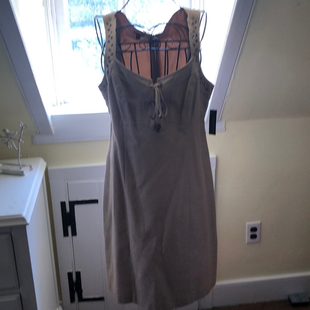Great leopard embossed khaki fabric, line d lace up top! Just a fun little dress!!