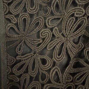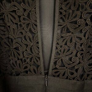 Elegant cocktail black dress, Size 10. Knee-length. Embroidered overlay on semi-open back. Belt around waist. Linen and rayon with cotton and acetate lining. Lightly used in great condition. Kept in a smoke-free and pet-free environment.