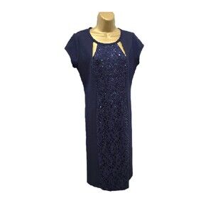 Cocktail Date Dress Womens 8 Sequin Lace Cut Out Short Sleeve Navy Blue Guest