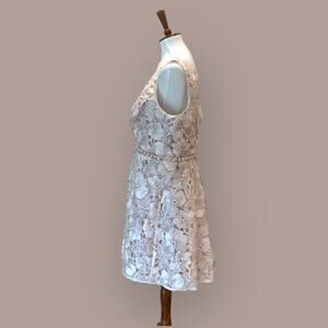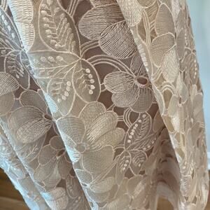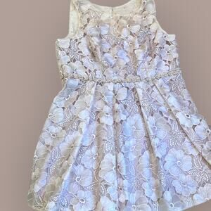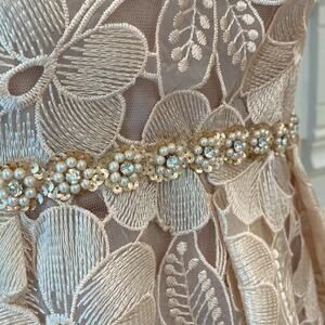 Pearly cream colored outer layer (with slight undertone of blush pink/beige(, floral cutouts/detailing. Lining is a silky, smooth, mauve color. Zips in the back with a keyhole button. Features a beaded waistline with faux pearls, rhinestones and sequins. Perfect for a formal occasion or a special night out! Would pair well with matching ballet flats or dazzling sparkly heels.
