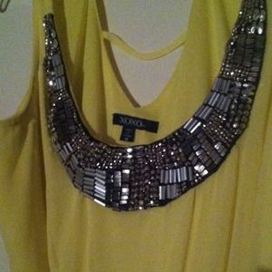 XOXO Yellow Cocktail Dress. Great dress for a cocktail event. Picture shows detail on the neck.