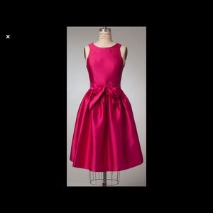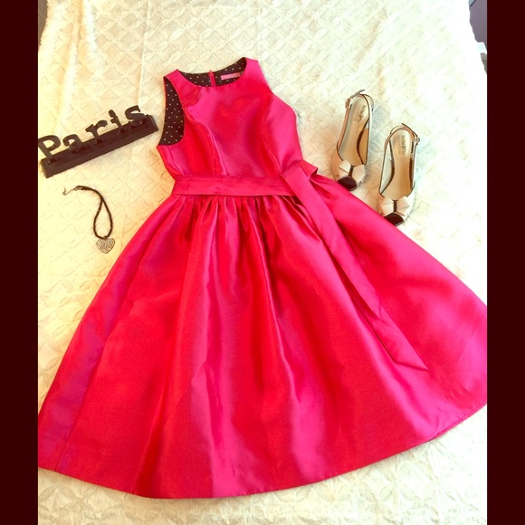 Designer, Isaac Mizrahi New York Fit & Flare Dress. Adorable like new dress. Worn once and dry cleaned. Shell and lining 100%Polyester Dry Clean only. Shell Hot pink with pleats and belt. Lining black and white polka dots. No damage. Length 25 inches and Bust is 30 inches.