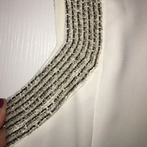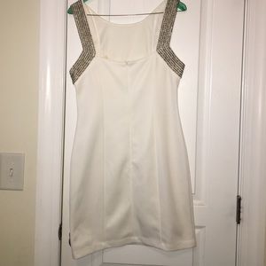 White dress with beaded embellishment around top. Very flattering! Great for a holiday party!
