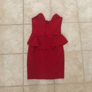 Red bow in the center, zip in the back, strapless. Built in bra, ruffles in the right spot to accentuate the right spots!