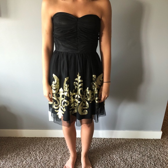 Black tulle strapless mini dress with matte gold sequin pattern on the skirt. Like new, worn once.