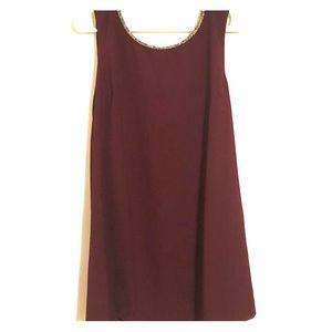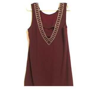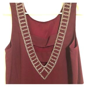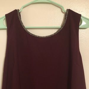 Wine colored cocktail dress with beaded neck line and deep-v beaded open back. I have worn the dress twice and have worn both sides as the front depending on the event. I have worn to a sorority formal and wedding. Very comfy and really pretty! small stain, very hard to notice, at the bottom of the back (the side with the v-pictured on picture #2)