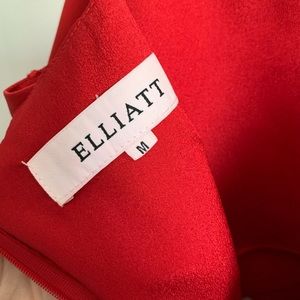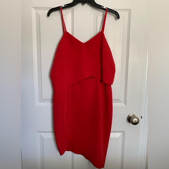 Red cocktail dress with asymmetric bottom. Small keyhole under bust where top overlays. Two tiny holes where tags were on left side. Not noticeable while wearing.