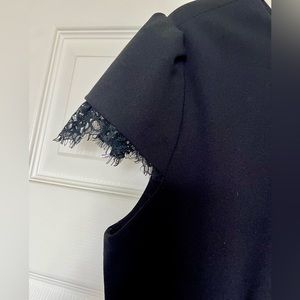 This is a black Betsy Johnson dress. Materials are lace, polyester with a satin slip attached on the inside. This dress was worn two times & dry cleaned once. Dress Size 14, length is a little above the knee. Very comfortable & form fitting. Back is zip-up. There is a tear on the outside of side seam, but very small and easy to fix - you can see in video.