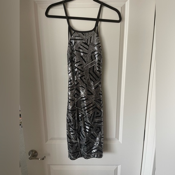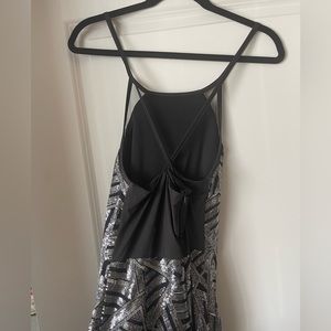 Cute black/ silver cocktail dress! Perfect for a night out! The straps cross in the back