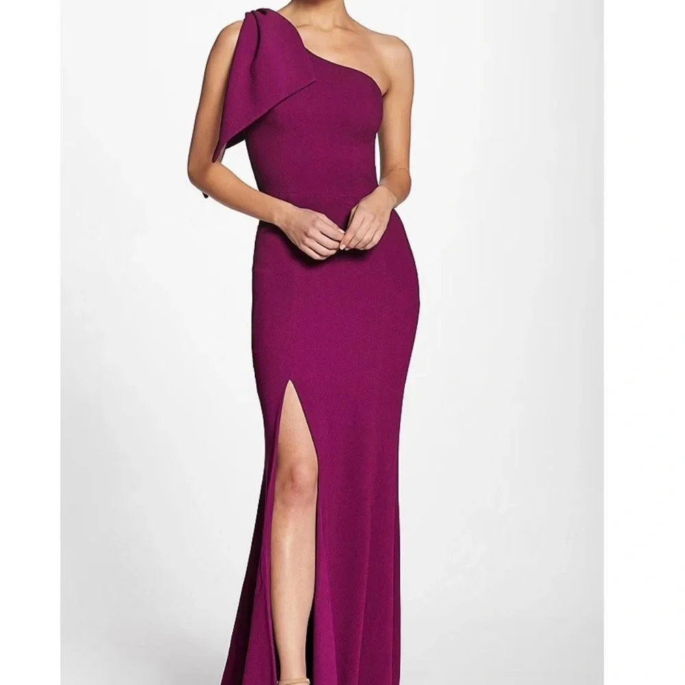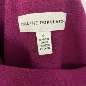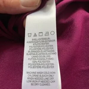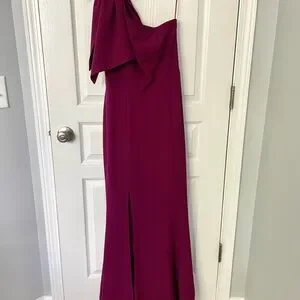 Stunning berry color is the first thing you’ll notice with this dress. Crepe polyester with spandex fabric stretches and moves with you. Sexy one shoulder design with high slit. Size Small, fits 2-4. I’m 5’4”, 124 lbs, 36B, fit perfect. Measures 16” pit to pit. Has been hemmed to my height with a 3 inch heel. Back has a subtle train, a bit longer than the front. Worn once, machine washes gently cycle like a dream. I’m happy to send additional measurements if requested.