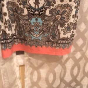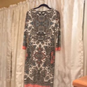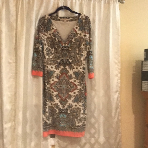 Great Comfortable Dress - has stretch terrific pattern v neck collar with back zipper fully lined too! Very attractive on anyone - great addition to your closet Colors black white teal and peach border