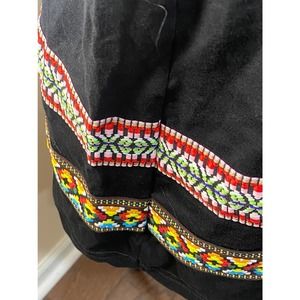 This simple dress lends itself to modern and boho styles. This is an A line shaped dress with a tank top bodice and a skirt that has a slight flare. The color is black. The coolest feature is the tribal design around the skirt.