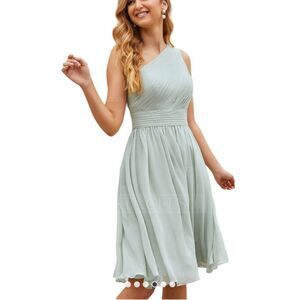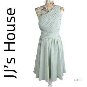 JJ's House A-line One-Shoulder Light Green Chiffon Knee-Length Cocktail Dress sz L in EXCELLENT like NEW condition! Perfect for any evening event wedding Cruise prom Homecoming Formal Dance Party. See photos for details and approximate measurements.