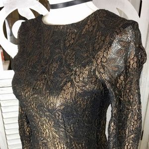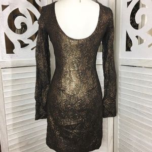 Size 4 form fitting cocktail dress by 2B Rych in deep bronze. Scooped open back and side zip. Long sleeves are sheer and bodice is fully lined.
