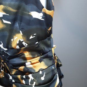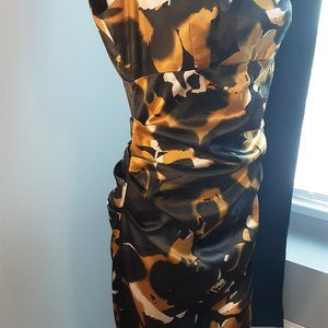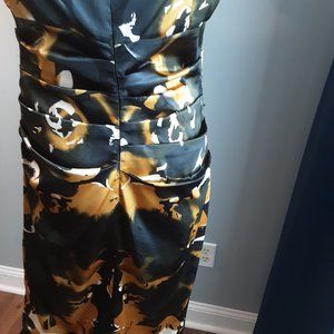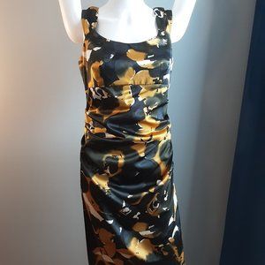 London Times cocktail dress in gold and black. Horizontal pleats in front and back to accentuate the fit. Sleeveless and not fully lined. Size 10. Self is 97% polyester and 3% spandex. Top of dress is lined in 100% polyester. This garment is used and in like new condition. Dry Clean Only.