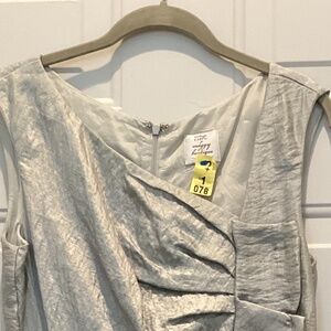 Silver/grey cocktail dress with beautiful front ruffles. Asymmetrical design. Size: 10 Lenght: 37” Width: 19” (armpit to armpit)