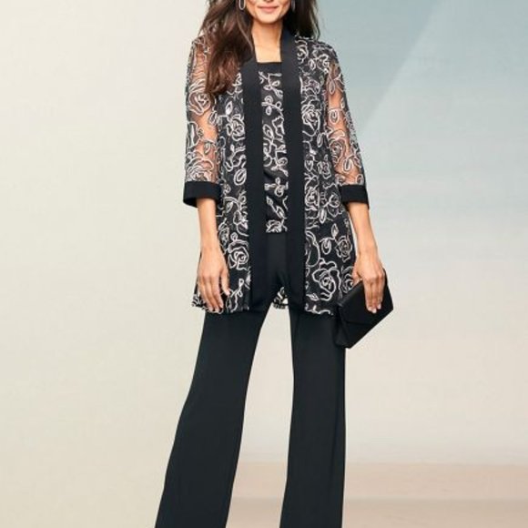 Now here's a pant set with panache. All-over floral soutache tells you this 3-piece set is a step above for stepping out. The jacket is trimmed in solid black for extra definition of its eye-catching sophistication. The matching soutache tank is lined at features solid knit at back. And the pull-on pants look just as good as they feel, with an all-around elastic waistband for comfort and ease.