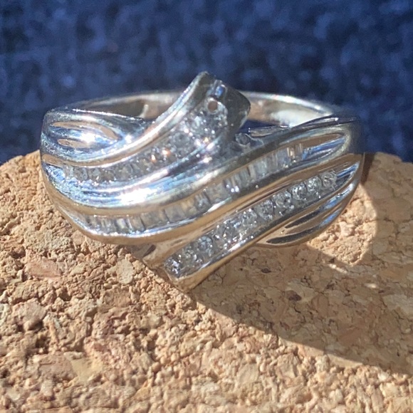 Beautiful cocktail ring baguettes and round diamonds silver setting. Missing one round diamond shown in pictures. I have no clue about this ring. I don’t know what it’s made of. It is a nice weightAnd looks elegant high end.