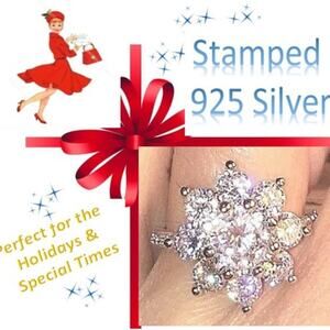Cocktail Ring Sterling Silver 925 Sz 8 Simulated Diamonds Luxury Star Flower NEW Avante Garde Romantic Love Holiday Christmas Wedding Prom Gift Idea Party Going Out
