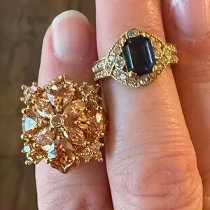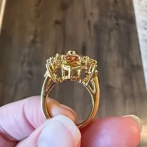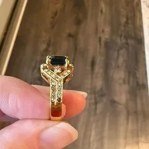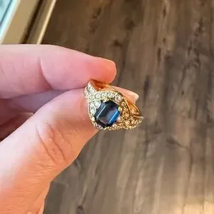 Yellow gold with a blue center and clear stones surrounding. One clear stone missing on the side, see photo.