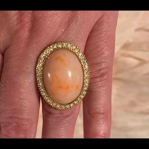 Beautiful statement cocktail rings, one with a beautiful round glittery stone and the other a marbled peach stone surrounded by crystals.