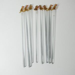 Set of 8 cocktail stirrers. They have clear glass sticks with brown birds on the ends. Due to their handmade nature, each bird is slightly different. They are about 8.5 inches long, including the 1 tall birds. Great shape, no chips or cracks, ready to use.