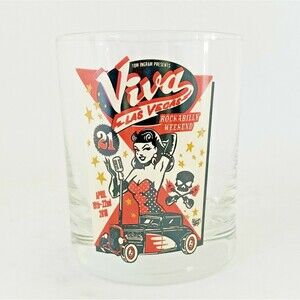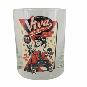 * Tom Ingram Presents Viva Las Vegas Rockabilly Weekend Pin-up Sexy Girl Cocktail Whiskey Glass April 19th-22nd 2018 Music Festival Designed by Vince Ray VLV21. Souvenir Glass.
